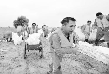 辽河油田的党员干部在抗洪抢险中身先士卒奋战在堤坝上。