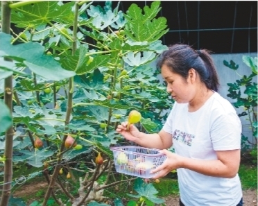 游客在西丰县四季果蔬采摘基地采摘无花果。
