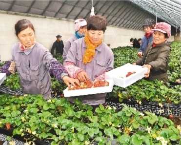 抚顺县石文镇农业苏子生态谷里果农正在采摘草莓。